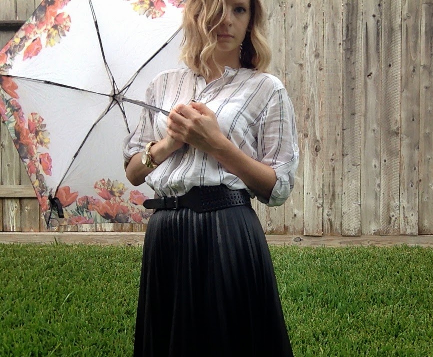 In the second outfit I paired the same chambray shirt with a waxed black skirt and heels. I added a skinny black belt with a gold chain detail to finish off the outfit details.
